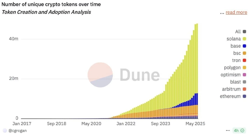 該当の図表によると、特にSolana(SOL)基盤のトークンが大半を占めていた。これはミームコイン発行プラットフォームPump.funのリリースの影響と考えられる。