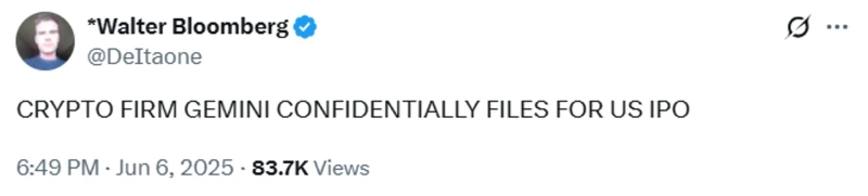 6日(現地時間)、経済速報アカウントWalter Bloombergによると、仮想通貨(暗号資産)取引所ジェミニが米国で非公開方式で新規株式公開(IPO)を申請した。