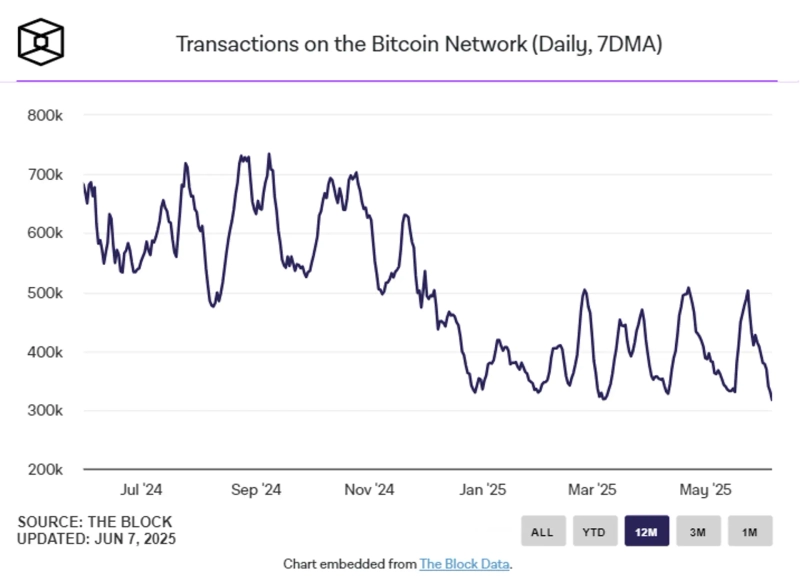 On the 8th (local time), The Block, a cryptocurrency-specialized media outlet, reported that despite Bitcoin maintaining its price near an all-time high, the number of transactions on the Bitcoin network last Friday was 317,000, marking the lowest level since October 2023 (269,000). On the 1st, only 256,000 block creations were recorded.