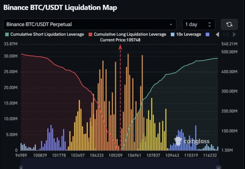 - ビットコイン(BTC)が107,000ドルを突破した場合、セントラライズドエクスチェンジ(CEX)でショートポジション約5億3,200万ドルが清算される見込みだと伝えられました。