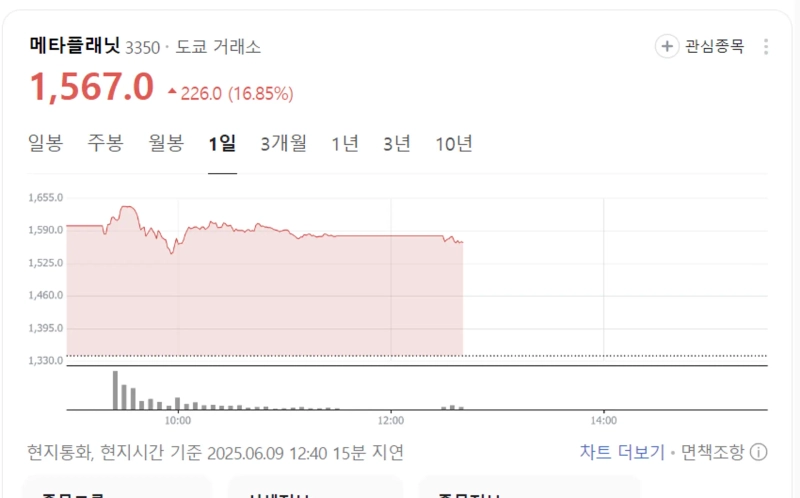 9日(韓国時間)午後1時、東京証券取引所によると、メタプラネットはこの日、前営業日比16.85%上昇の1,567円で取引されています。