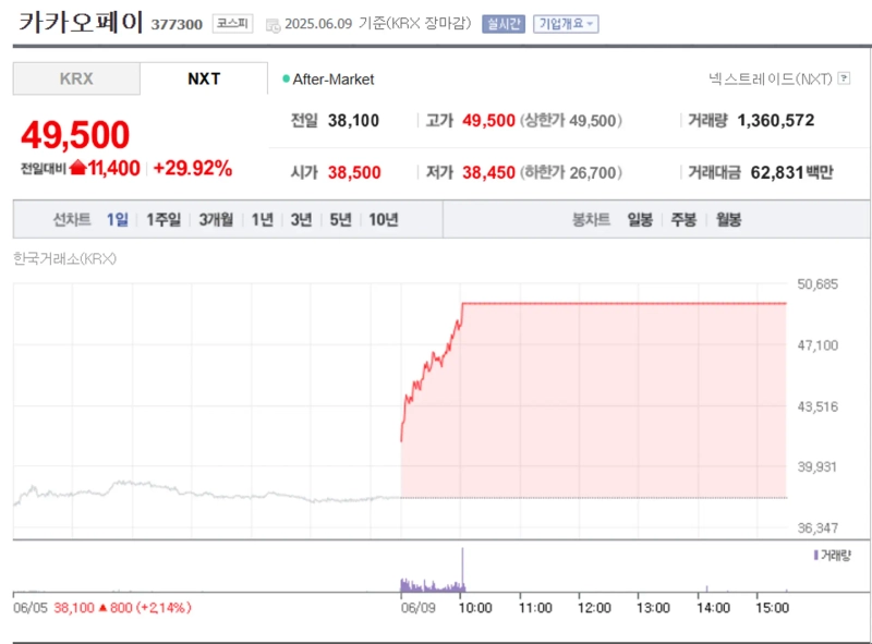 9日(現地時間)、有価証券市場(KOSPI)でカカオペイは前日比29.92%高い49,500ウォンとなった。先月21日からなんと70%ほど上昇した数値だ。