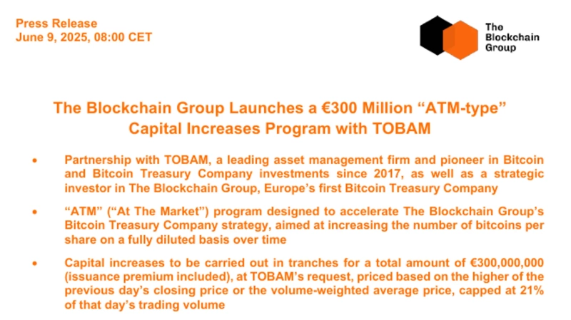 9日(現地時間)、ザ・ブロックチェーングループはプレスリリースを通じて「資産運用会社TOBAMと3億ユーロ(3億4000万ドル)規模の有償増資契約を締結した」と発表しました。さらに「今回の契約を通じてビットコイン保有量を増やすことが目的」であり、「有償増資は時価発行(ATM)方式で行う」と補足しました。
