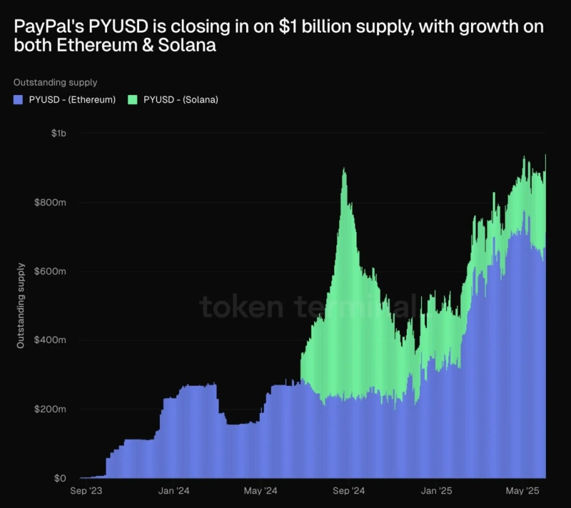 ペイパルのドル建てステーブルコインであるペイパルUSD(PYUSD)の時価総額が10億ドルに近づいていることが明らかになった。