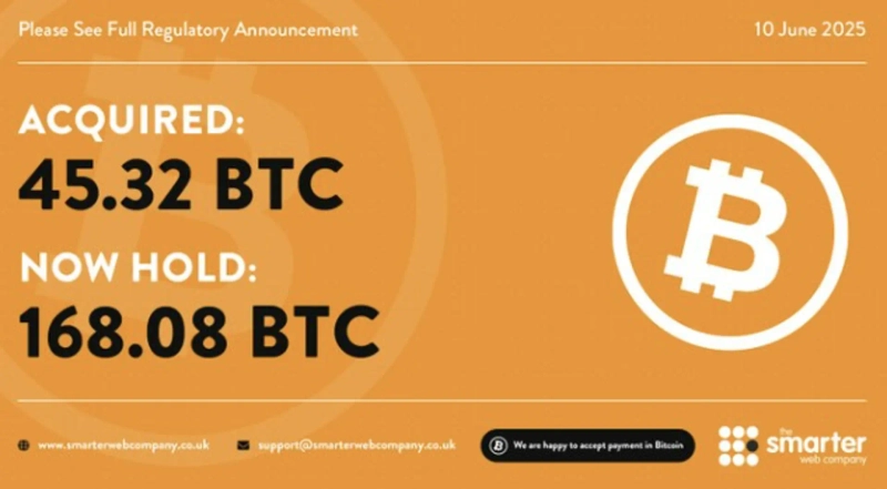 - Smarter Web Company stated that, in line with its '10-year plan' to continuously acquire Bitcoin, it now holds a total of 168.08 units.