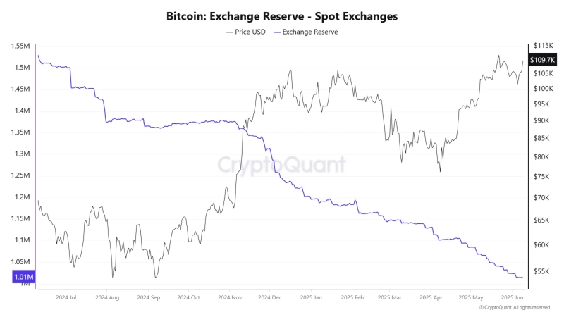 10日(現地時間)、BaykusChartsの仮想資産アナリストはX(旧Twitter)を通じて「取引所から継続的なビットコイン流出が見られる」とし「投資家がビットコインを長期間保有しようとする心理が強まっている」と述べました。CryptoQuantのデータによると、現在取引所内に保管されているビットコインは101万個であり、昨年7月の155万BTCと比べて大幅に減少しています。