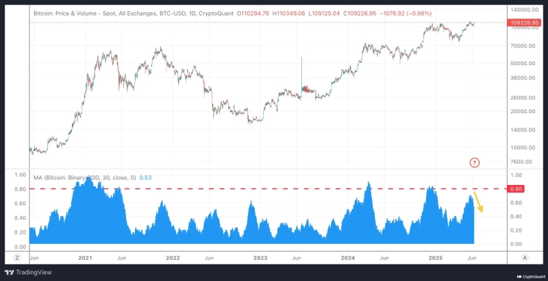 10日(現地時間)、Avocado_onchain CryptoQuant寄稿者はレポートで「今回の上昇相場は以前とは異なり、はるかに静かな雰囲気で進んでいる」とし、「現在のオンチェーン指標はBitcoinの追加上昇を示唆している」と述べました。続けて「Bitcoin価格が上昇しているにもかかわらず、Binary CDD(Binaray CDD)の30日移動平均線は下落傾向を示している」とし、「これは長期投資家が依然としてBitcoinの保有を選択しているということだ」と語りました。