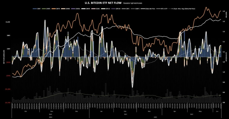 10日(現地時間)、トレーダーTのデータによると、アメリカで取引されているビットコイン現物ETFの総純流入額は4億2788万ドルと集計されました。ビットコイン取引の基準価格(VWAP)は10万8740ドル水準です。