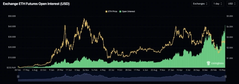 イーサリアム(ETH)無期限先物の未決済建玉(OI)が過去最高を記録したことが明らかになりました。