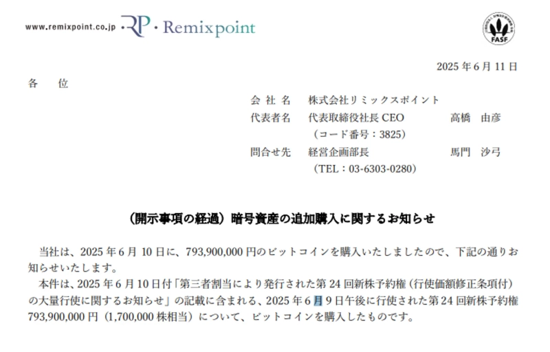 11日(現地時間)、Remixpointはプレスリリースで「7億9390万円を投資して50BTCを追加で買い増した」と発表しました。現在までに保有しているビットコインは925個に達しています。