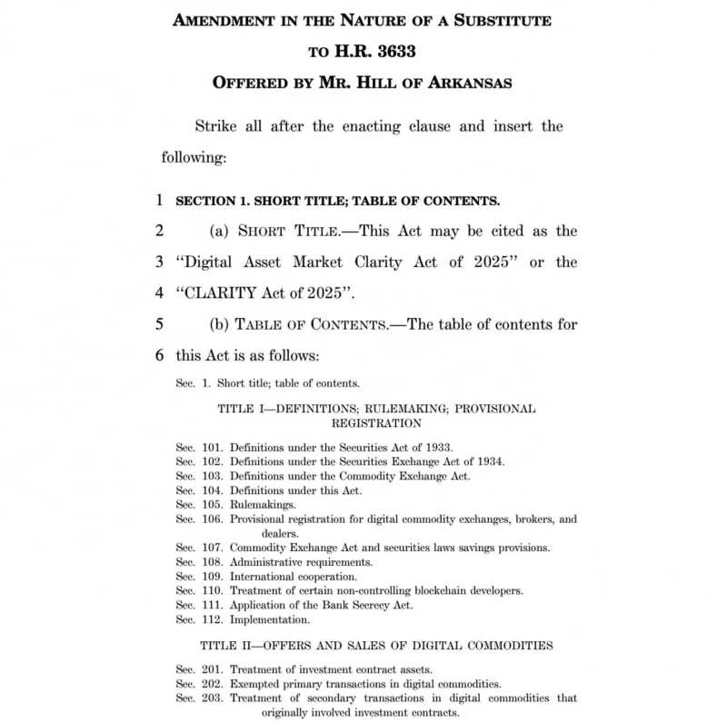 フレンチ・ヒル米下院金融サービス委員長は「(クラリティ法は)公正で未来志向の規制体系構築のための法律だ」とし、「クラリティ法で(暗号資産)市場を弱体化させうるあらゆる事案に対応していく」と述べた。
