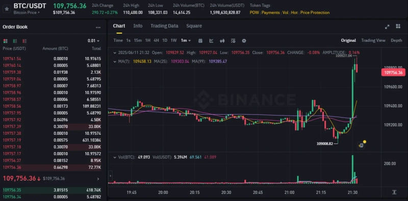 予想を下回るCPIの結果を受け、10万9,000ドル前半で取引されていたビットコイン(BTC)も一時10万9,927ドルまで急上昇した。午後9時32分現在、バイナンスUSDT市場基準でビットコインは24時間前比0.27%上昇の10万9,756ドルで取引されている。