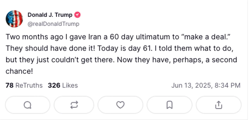 13日(現地時間)、トランプ大統領は自身のTruth Socialアカウントで「私は二か月前、イランに60日以内に交渉するよう最後通告を与え、彼らはそうしなければならなかった。今日はその60日目の翌日、61日目だ」と明らかにした。