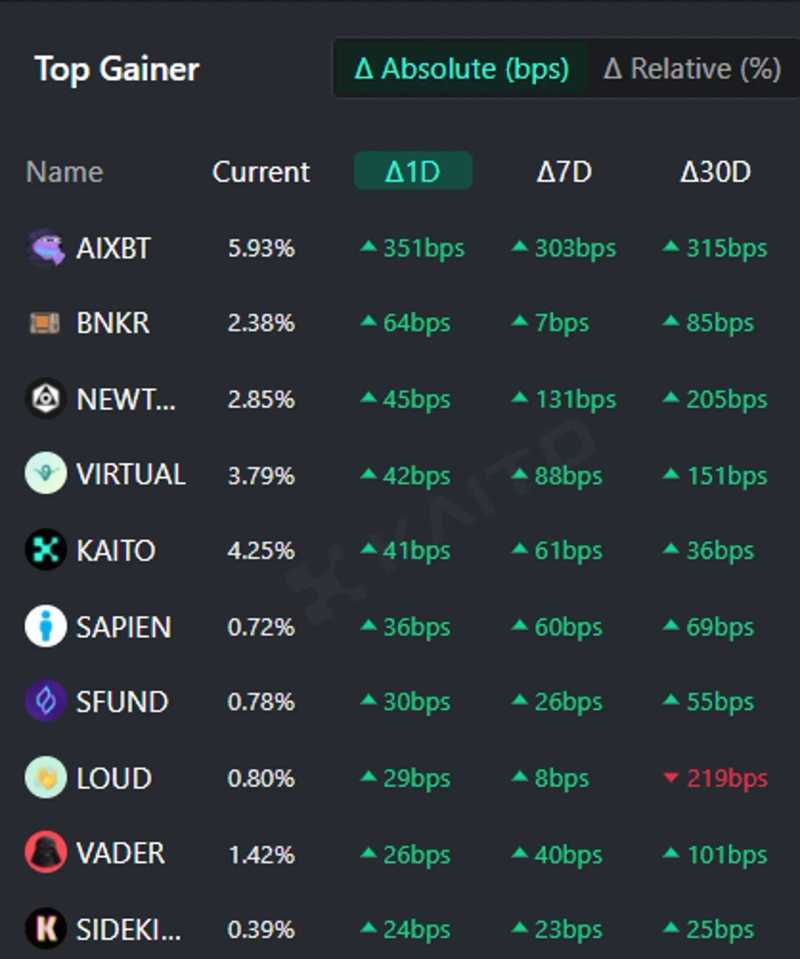 - AIベースのWeb3検索プラットフォームKaito(カイト)のマインドシェア基準で、AIXBT(エイアイエックスビーティ)、BNKR(バンカー)、NEWTON(ニュートン)などの仮想資産が投資家の関心を集めていると伝えた。