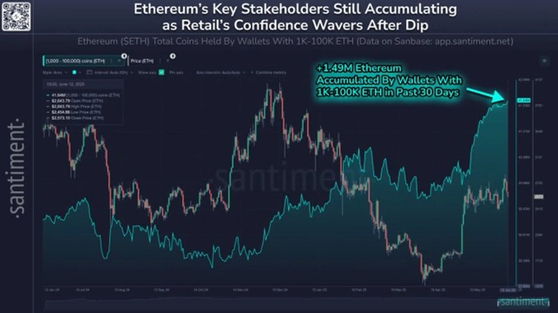 15日(現地時間)、The Coin RepublicはSantimentのデータを引用し、クジラによるイーサリアムの保有量が過去30日間で149万枚増加したと報じた。一方で、同期間に個人投資家は利益確定のために売却を行ったことが分かった。