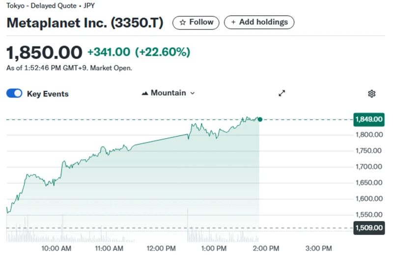 16日(現地時間)、東京証券取引所によると、メタプラネットは前取引日比22.60%高の1850円で取引されています。
