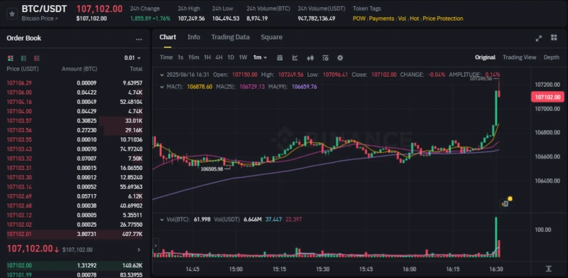 午後4時31分現在、バイナンスUSDTマーケットにおいてビットコインは24時間前比1.76%上昇の10万7102ドルで取引されています。