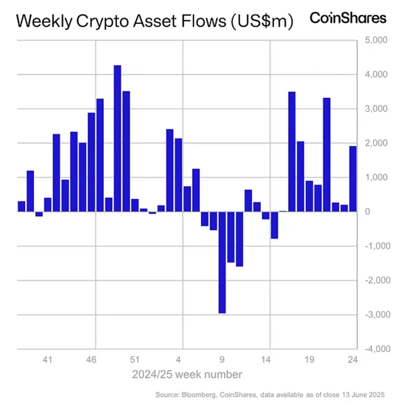 先週、グローバルな仮想資産(暗号資産)投資商品に$1,917,000,000が流入し、9週連続で純流入傾向が続きました。