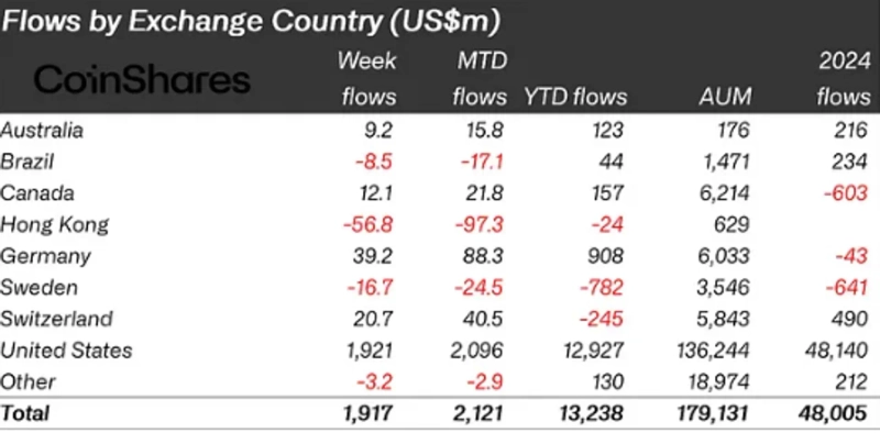 国別では米国発の流入傾向が強くみられました。米国拠点の仮想資産商品だけでおよそ$1,900,000,000の純流入となり、ドイツ、スイス、カナダでもそれぞれ$39,200,000、$20,700,000、$12,100,000の流入が確認されました。一方、香港とブラジルでは、それぞれ$56,800,000、$8,500,000の純流出となりました。
