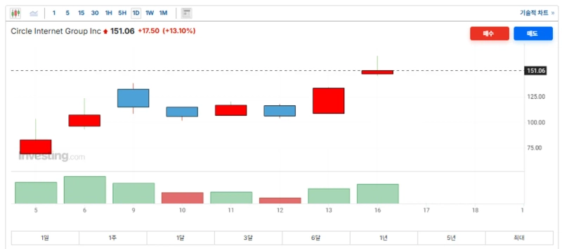 17日(現地時間)、Investing.com(インベスティング ドットコム)によると、前日、Circle(サークル)は前日比13.10%上昇の151.06ドルで取引を終え、時価総額が336億1,700万ドルに到達した。これは上場価格31ドルと比べて約387%上昇した数値となる。取引中の最高値は165ドル台を記録し、市場の大きな関心を反映した結果となった。