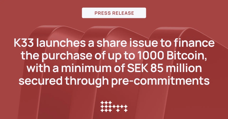 ビットコイン(BTC)の財務戦略を発表したスウェーデンの暗号通貨ブローカーK33は、8,500万クローナ(約888万ドル)規模の有償増資を発表しました。