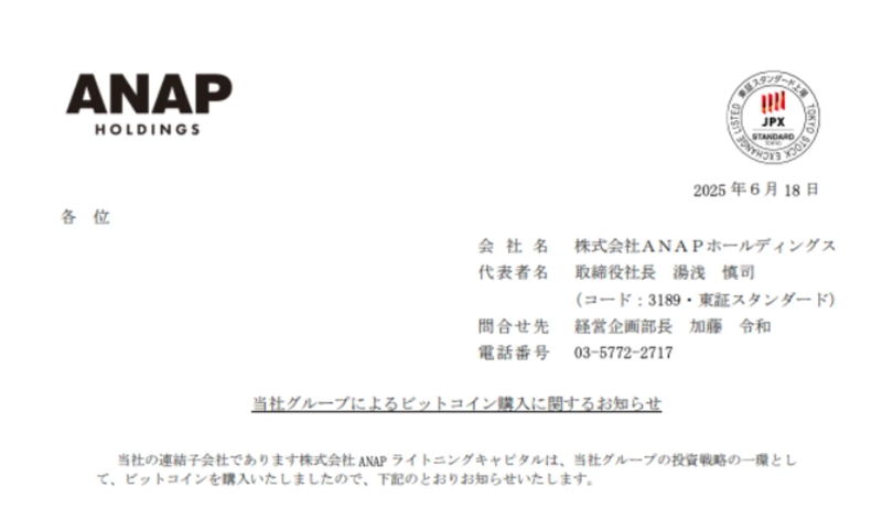 - ANAPは2025年8月までに1000ビットコイン以上を取得する計画を発表した。