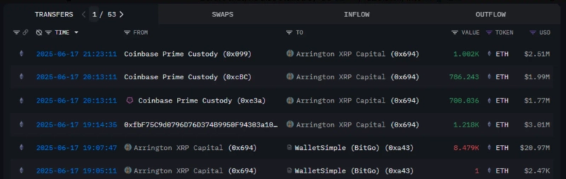 - アーリントン・キャピタルがコインベースでイーサリアム(ETH) 2489個を出金したと明らかにしました。