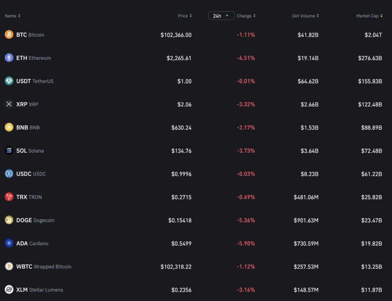 21日(現地時間)午後12時03分時点で主要仮想資産はほとんどが値下がりを示した。バイナンス基準の時価総額1位ビットコイン(BTC)は102,366ドルで前日比1.11%下落し、2位イーサリアム(ETH)は6.51%急落して2,265.61ドルで取引された。リップル(XRP)は2.06ドルで3.32%、ソラナ(SOL)は134.76ドルで3.73%下落した。