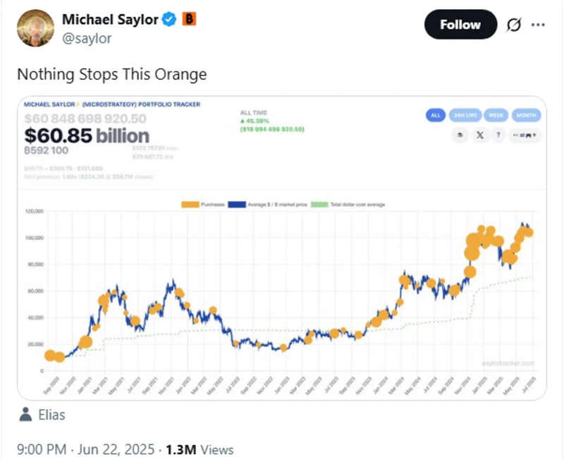 22日(現地時間)、マイケル・セイラー ストラテジー最高経営責任者(CEO)はX(旧Twitter)を通じて「オレンジドットを止められるものはない」と述べ、「セイラー・トラッカー・チャート」を投稿した。