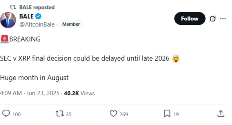 23日(韓国時間)、Coinpediaによれば、Altcoin BaleというX(旧Twitter)のユーザーが自身のアカウントを通じて「SECとリップル訴訟の最終判決が2026年まで延期される可能性がある」と主張しました。