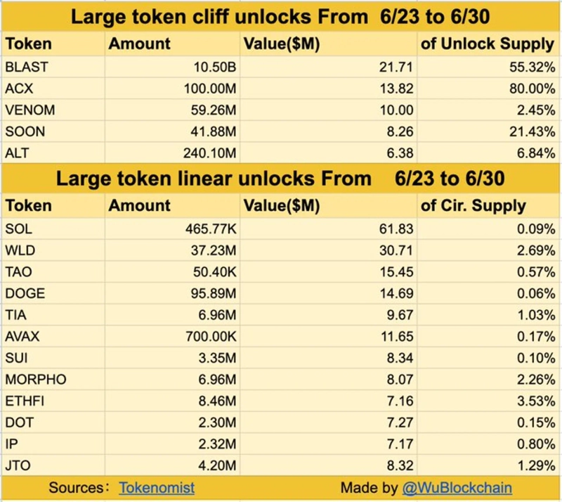 この日Wu BlockchainはX(旧Twitter)を通じて「23日~30日の間にBlast(BLAST)、Across Protocol(ACX)、Venom(VENOM)、Soon(SOON)、AltLayer(ALT)の“クリフアンロック(一度で予定数量がすべて配布されるアンロック)”が行われ、Solana(SOL)、Story(IP)、Worldcoin(WLD)などの“リニアアンロック(一定期間にわたり定められた数量が順次配布されるアンロック)”が進行される」と伝え、「アンロックされるトークンの価値は2億5,000万ドルに達する」と報じた。