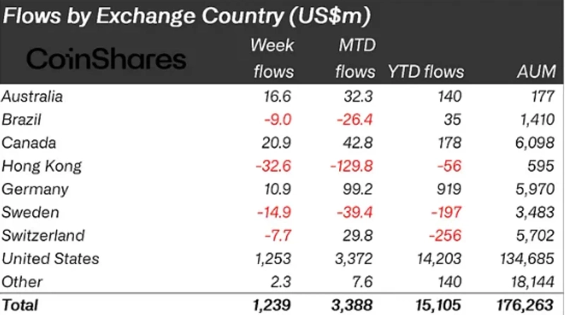 国別ではアメリカからの流入が顕著でした。アメリカ発の仮想資産商品だけで約12億5,000万ドルの純流入があり、カナダ、ドイツ、オーストラリアがそれぞれ2,090万ドル、1,090万ドル、1,660万ドルの流入を記録しました。一方で、香港、スウェーデン、スイスはそれぞれ3,260万ドル、1,490万ドル、770万ドルの純流出となりました。