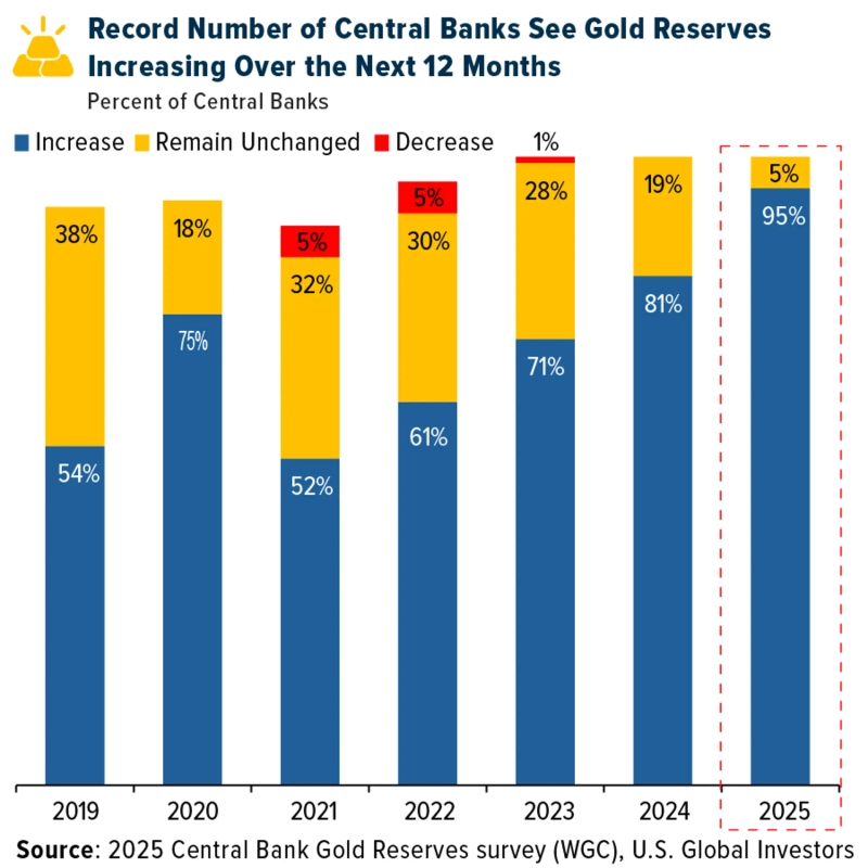 これは非常に注目すべきことであり、WGCの最近の調査結果とも一致しています。WGC調査では、95%の中央銀行が今後12ヶ月以内に金準備を増やす見通しを示しています。これはWGCが調査を始めて以来、最も高い数値です。