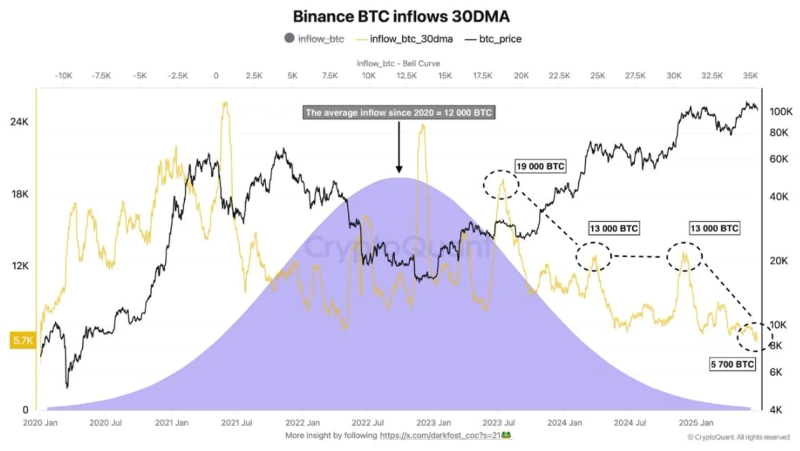 グローバル暗号資産(仮想通貨)取引所であるバイナンスにおけるビットコイン(BTC)の流入量が最低水準になったとの主張が出ました。