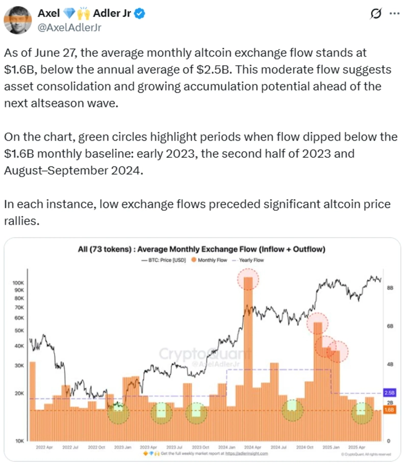 - 主要取引所の最近のアルトコイン出入金額が約16億ドルと、年間平均25億ドルを大きく下回っていると述べた。