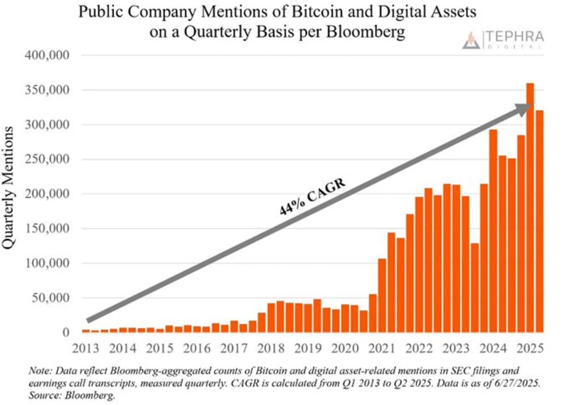 27日(現地時間)、テフラ・デジタルがX(旧ツイッター)を通じて共有したデータによると、上場企業によるビットコインへの言及は2013年の0件から最近では35万件にまで急増した。