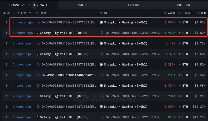 27日(現地時間)、ルックオンチェーンによると、シャープリンク・ゲーミングは5時間前に店頭取引(OTC)を通じてイーサリアム1989ETH(約4,820,000ドル)を追加購入した。