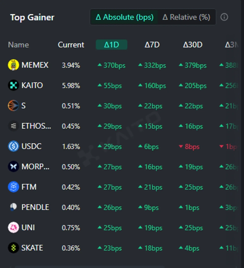 - カイトのトークン・マインドシェアトップゲイナー基準で、ミームX(MEMEX)とカイト(KAITO)がグローバル市場で最も注目を集めていると伝えられました。