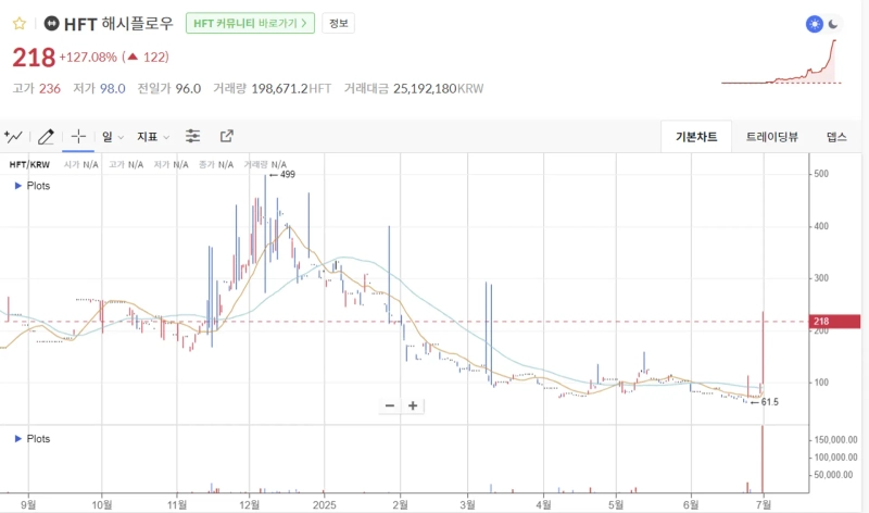 1日(韓国時間)午前7時18分現在、ハッシュフローは国内仮想資産取引所コインワンで前日比127.08%急騰した218ウォンで取引されている。