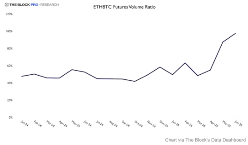 1日(韓国時間)、暗号資産専門メディアのザ・ブロックによると、この日基準でイーサリアムとビットコインの先物取引量の比率は98%で、前年同期比で約50%ポイント増加した水準を記録したという。