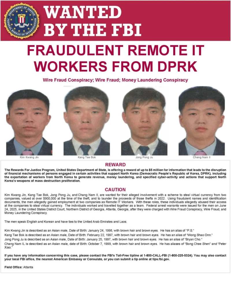 米国FBIは北朝鮮のハッカー4人を電信詐欺およびマネーロンダリング容疑で起訴し、指名手配(写真)しました。