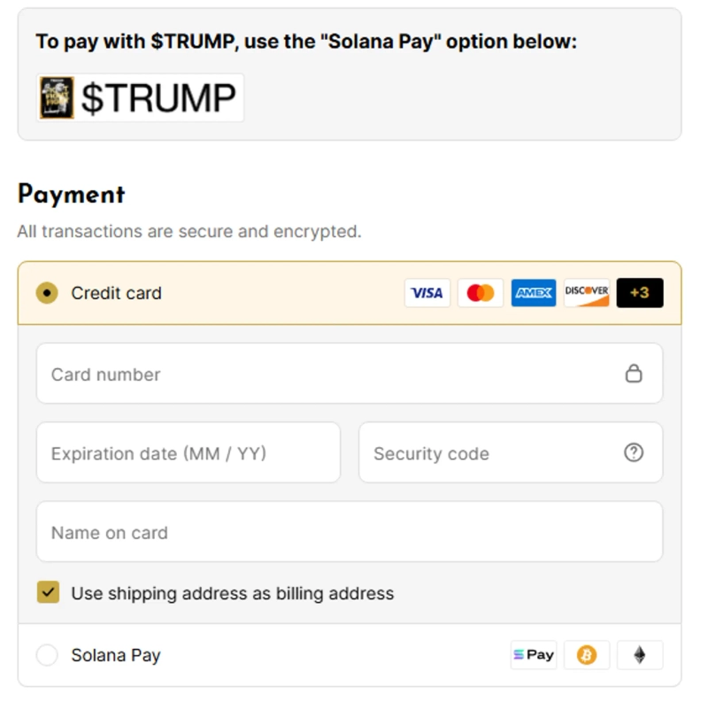 トランプグッズストアの決済画面でSolana Payオプションを選択すると、暗号資産(仮想通貨)による決済が可能です。