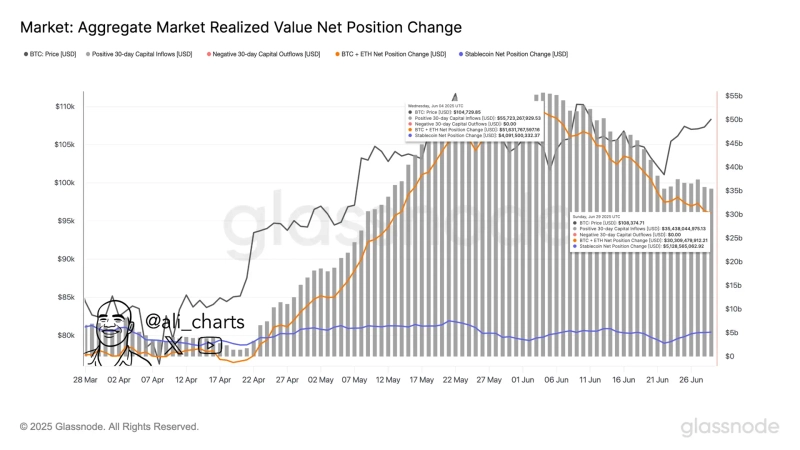 1日(現地時間)、アリ・マルティネス暗号資産アナリストはX(旧ツイッター)を通じて「6月29日(現地時間)における暗号資産市場の資本流入額は、4日(現地時間)と比べて約200億ドル減少した」と発表した。
