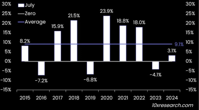 1日(現地時間)、マトリクスポートはレポートで「歴史的にビットコインは7月に強いパフォーマンスを見せてきました」とし、「過去10年で7回上昇しており、平均収益率は9.1%に達しました」と伝えました。さらに「下落した3回も緩やかな下落にとどまりました」とし、「今後数週間以内にビットコインは116,000ドルに到達する可能性がある」と述べました。