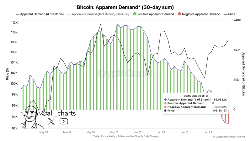 1日(現地時間)、アリ・マルティネス仮想通貨(暗号資産)アナリストはX(旧Twitter)を通じて「ビットコインに対する表面上の需要が-3万7000BTCまで低下した」とし、「投資家の需要が急激に減少している兆候だ」と明らかにしました。