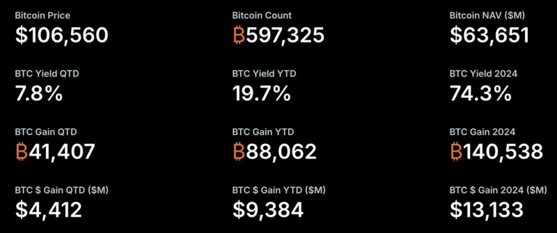 1日(現地時間)、ストラテジー創業者のマイケル・セイラー氏はX(旧Twitter)を通じて「ストラテジーは過去第2四半期に7.8%のビットコイン収益率を記録した」とし、「これは約44億ドル規模で、4万1407BTCが増加した効果だ」と述べました。