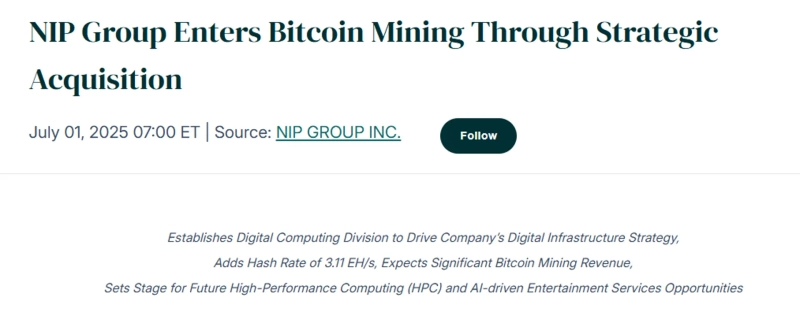 ナスダック上場企業のNIPグループがビットコイン(BTC)マイニング業界に進出します。