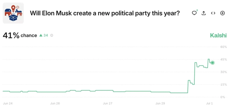 - アメリカの分散型予測プラットフォームであるカルシによると、今年イーロン・マスクが新党を設立する確率が41%まで急騰したと伝えられています。