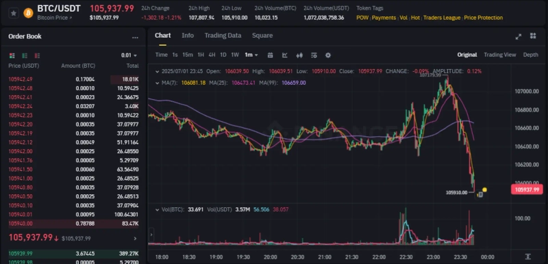 午後11時45分現在、バイナンスUSDT市場基準でビットコインは24時間前比1.21%下落の105,937ドルで取引されている。