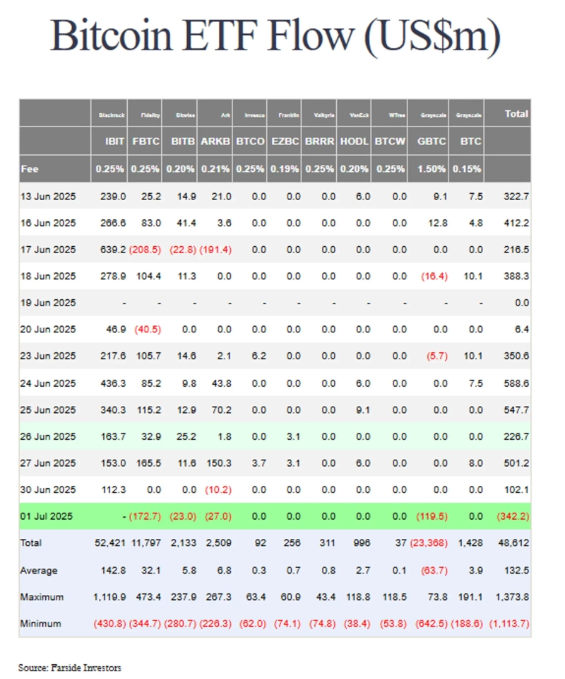 1日(現地時間)、ファーサイド・インベスターズのデータによると、ビットコイン現物ETFからは約3億4200万ドルの資金が流出しました。これは、6月9日以降約1ヶ月半ぶりの純流出となります。